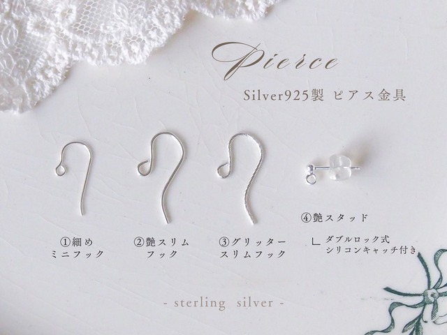 【⠀ silver925 製 (スターリングシルバー) ピアス金具 】 ① 当店で一番小さなサイズのフック。 小ぶりなモチーフに対応可能。 線が細いのでピアスホールが小さい方にも。 (こちらは重さがあるモチーフの場合は 負荷がかかるため、選択不可となります。) ② 当店のピアスの標準フックはこちら。 お耳元に沿うカーブ形状でフィット感が良く 比較的落ちにくいところもおすすめです。 ③ 上記②にグリッター加工(凸凹模様)が 施され、キラキラと煌めくフックです。 華やかなデザインがお好きな方におすすめ♡ ④ 定番のスタッドポストはこちら。 長さを出したくない方におすすめです。 モチーフの邪魔をしないデザインです。 ↪︎ silver925製 ダブルロック式シリコンキャッチ付き お好みの金具がございましたら 購入時のオプション選択よりお選び下さいませ ここに掲載していない金具もございますので 他にご希望のものがございましたら お気軽にお問い合わせくださいませ ⋆*