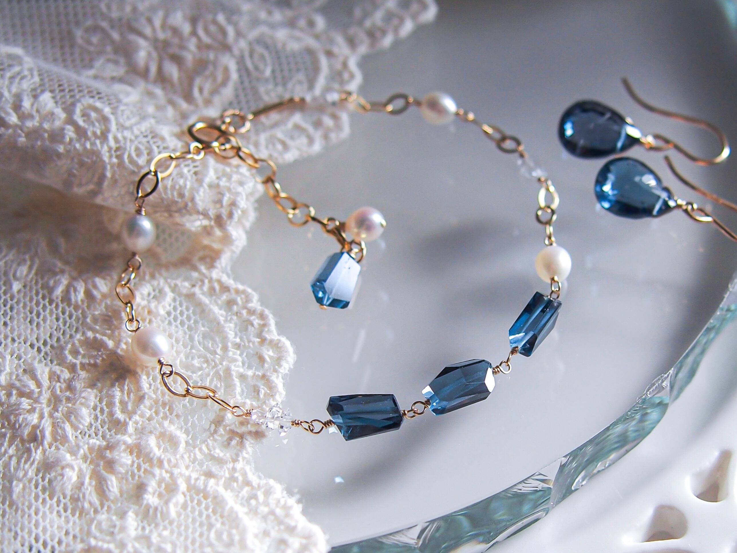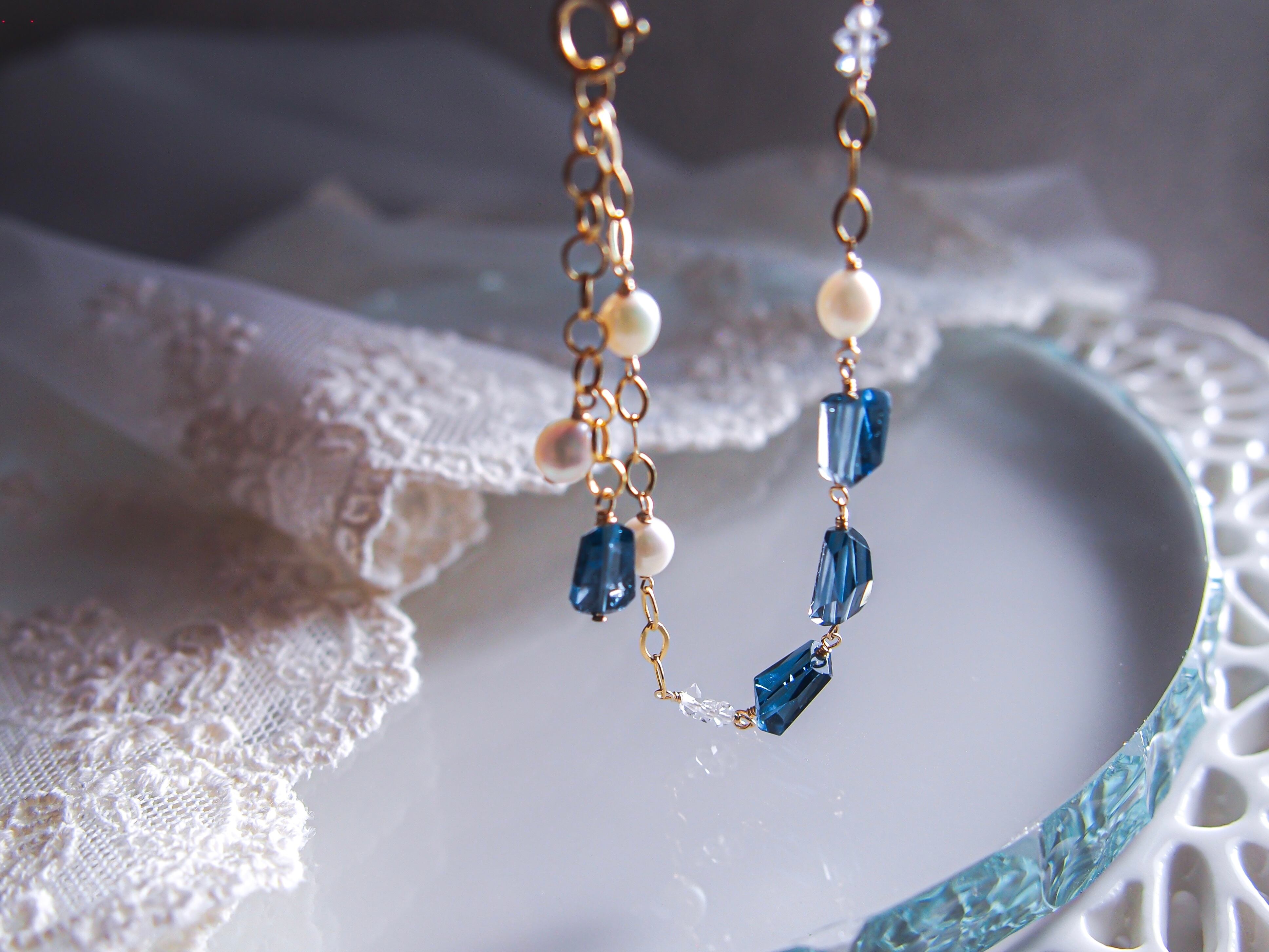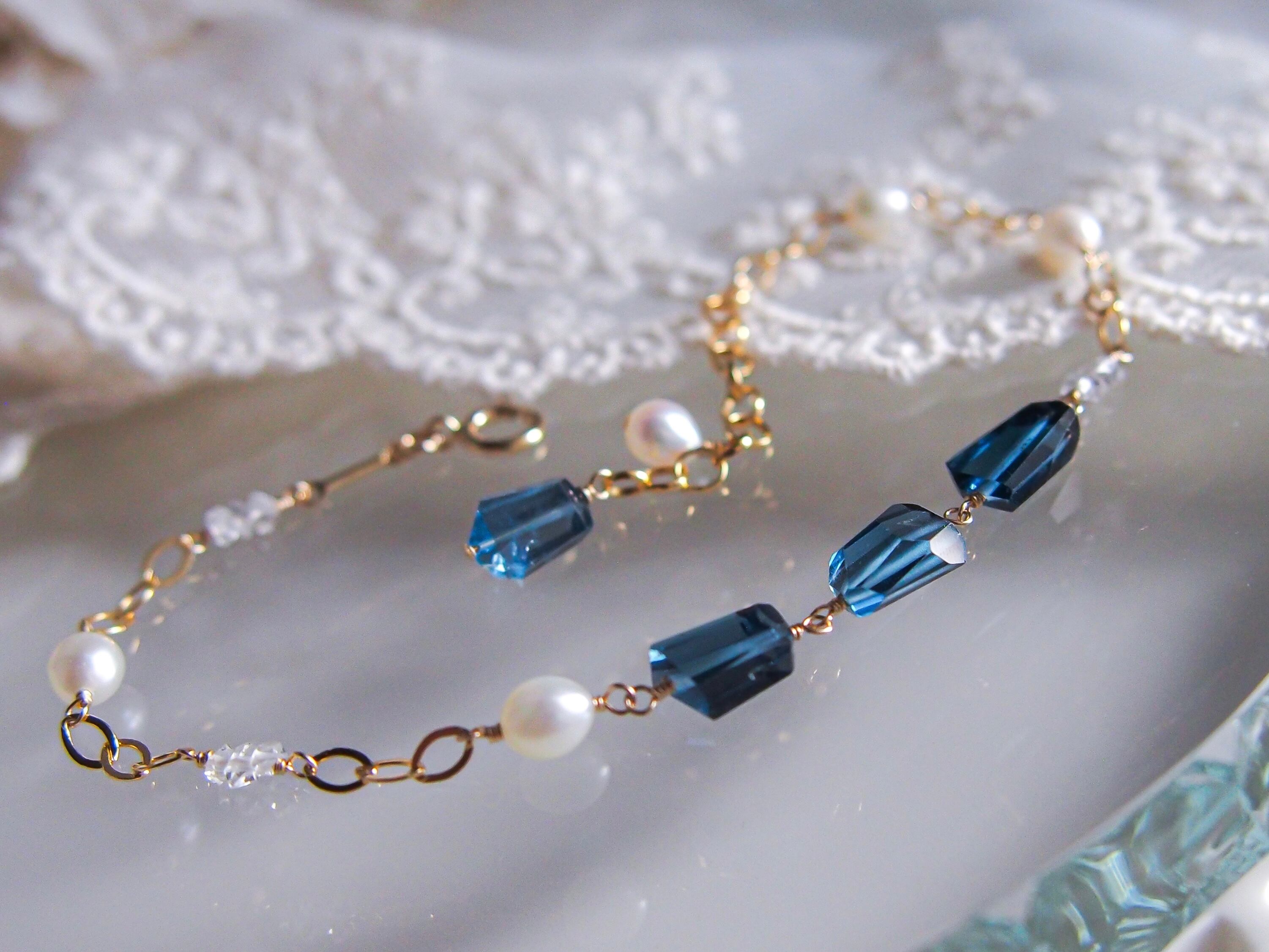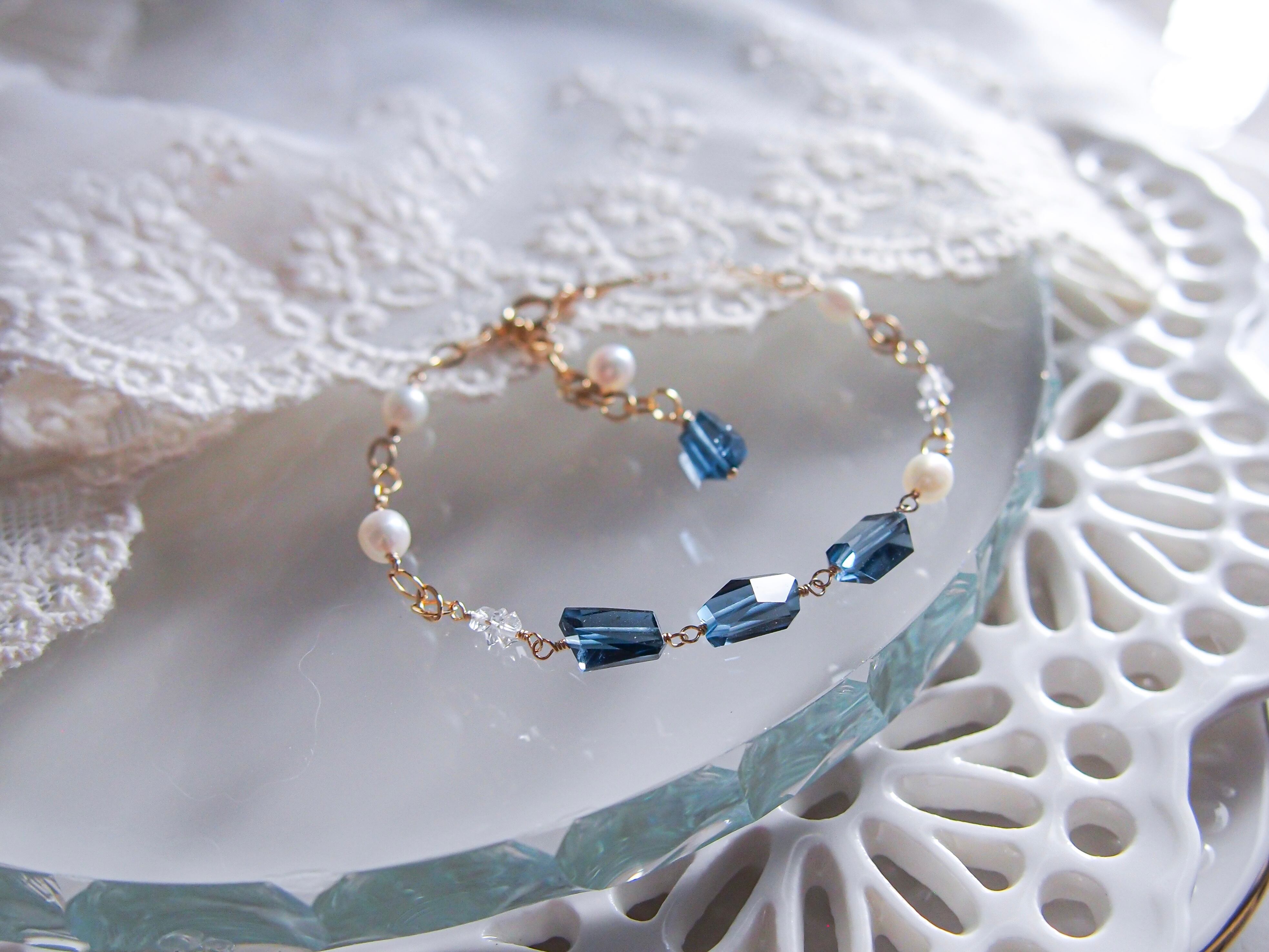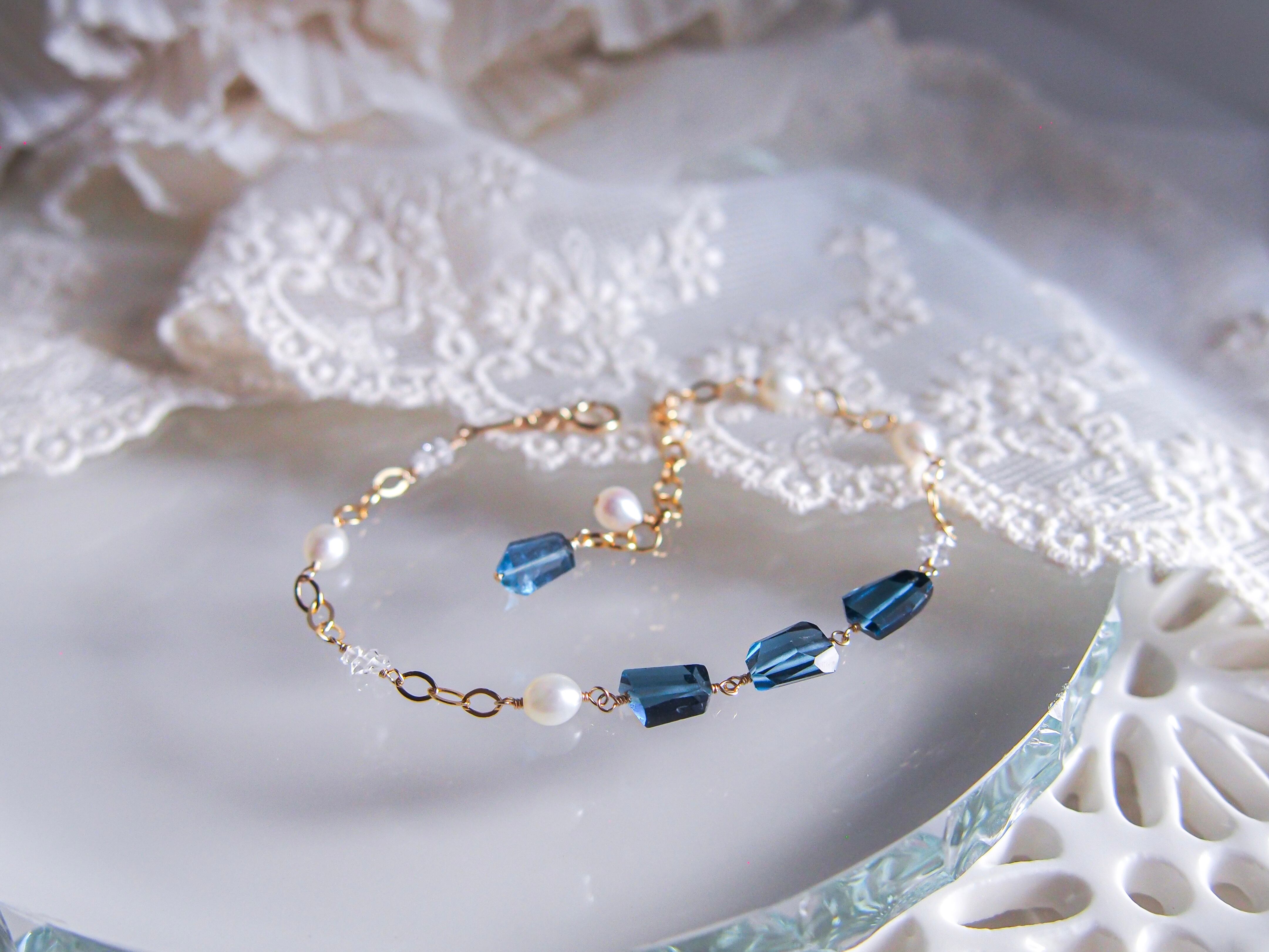 【 silent night 】|宝石質 ロンドンブルートパーズ × 淡水パール × ダイヤモンドクォーツ ブレスレット|14kgf ゴールド 天然石 真珠 トパーズ 11月誕生石