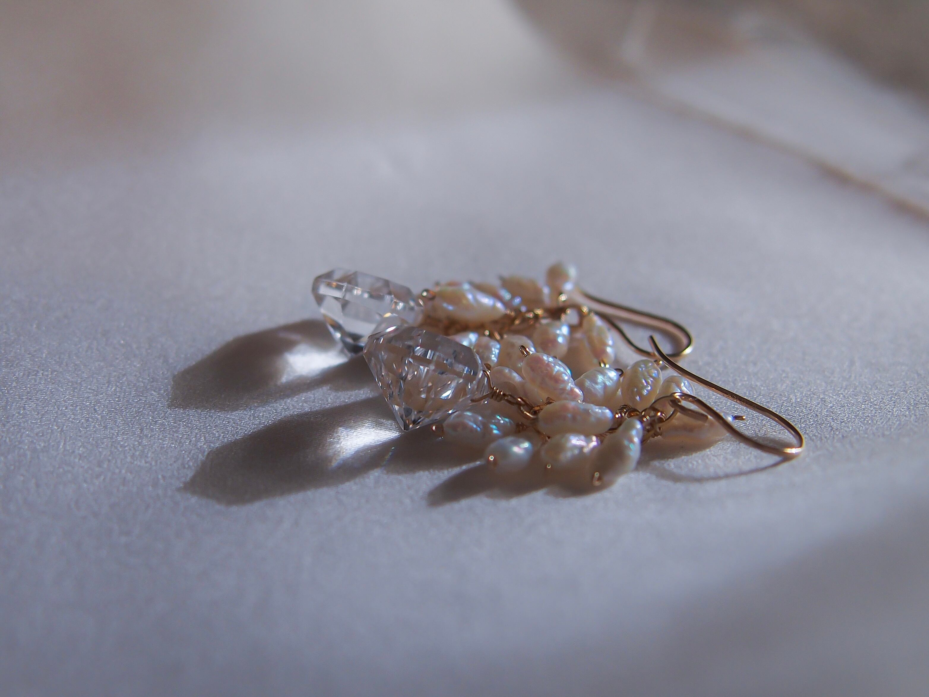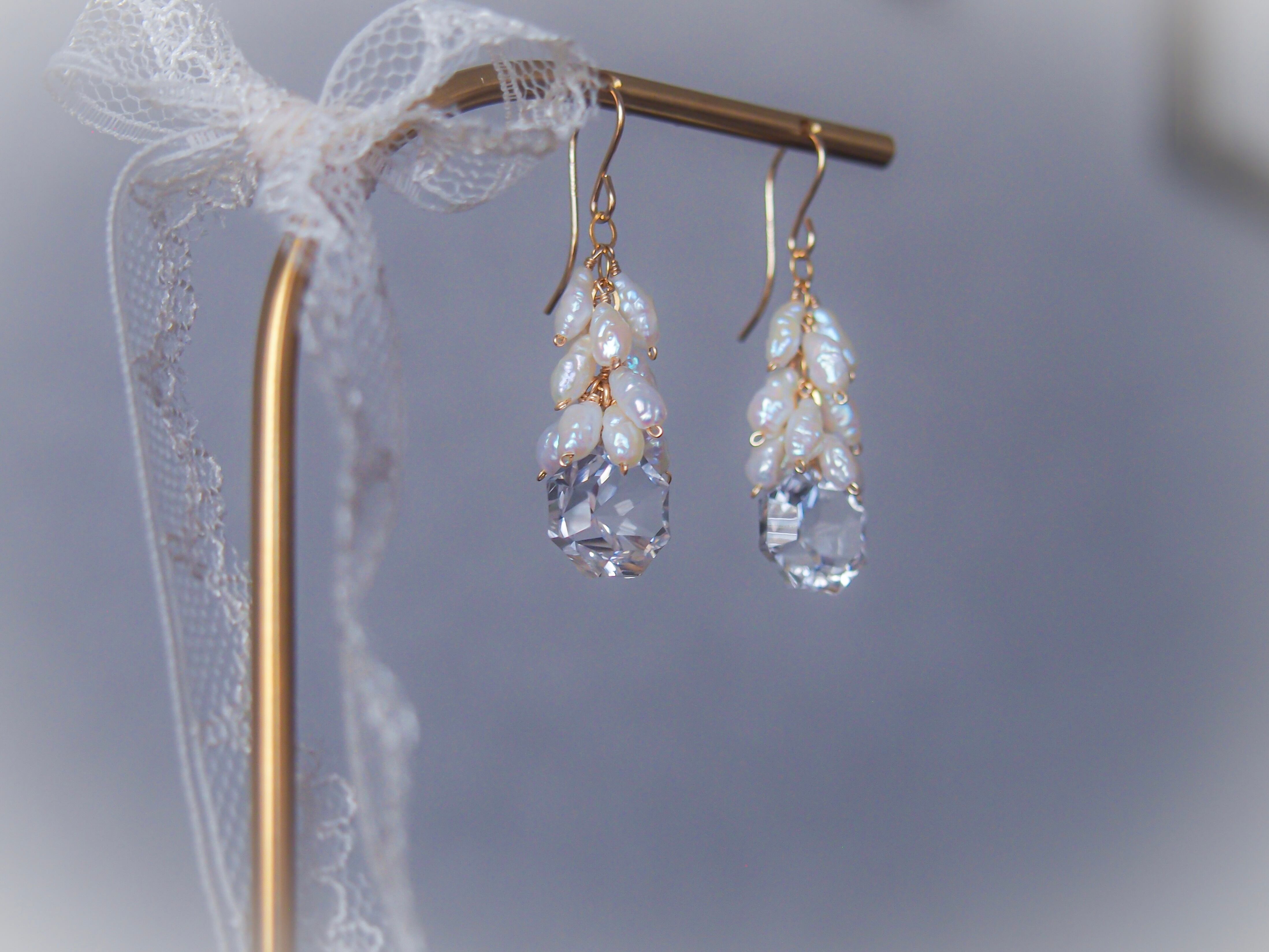 淡水パールとクリスタル水晶の耳飾り。