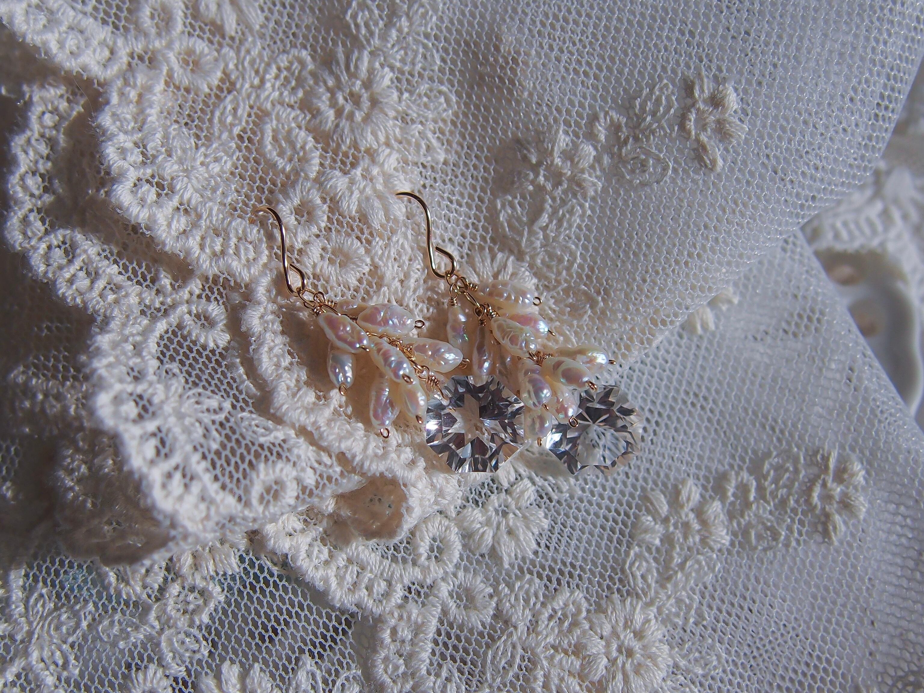 【 antique dress 】クリスタル水晶と淡水パールのピアス/イヤリング|14kgf 淡水パール 6月誕生石