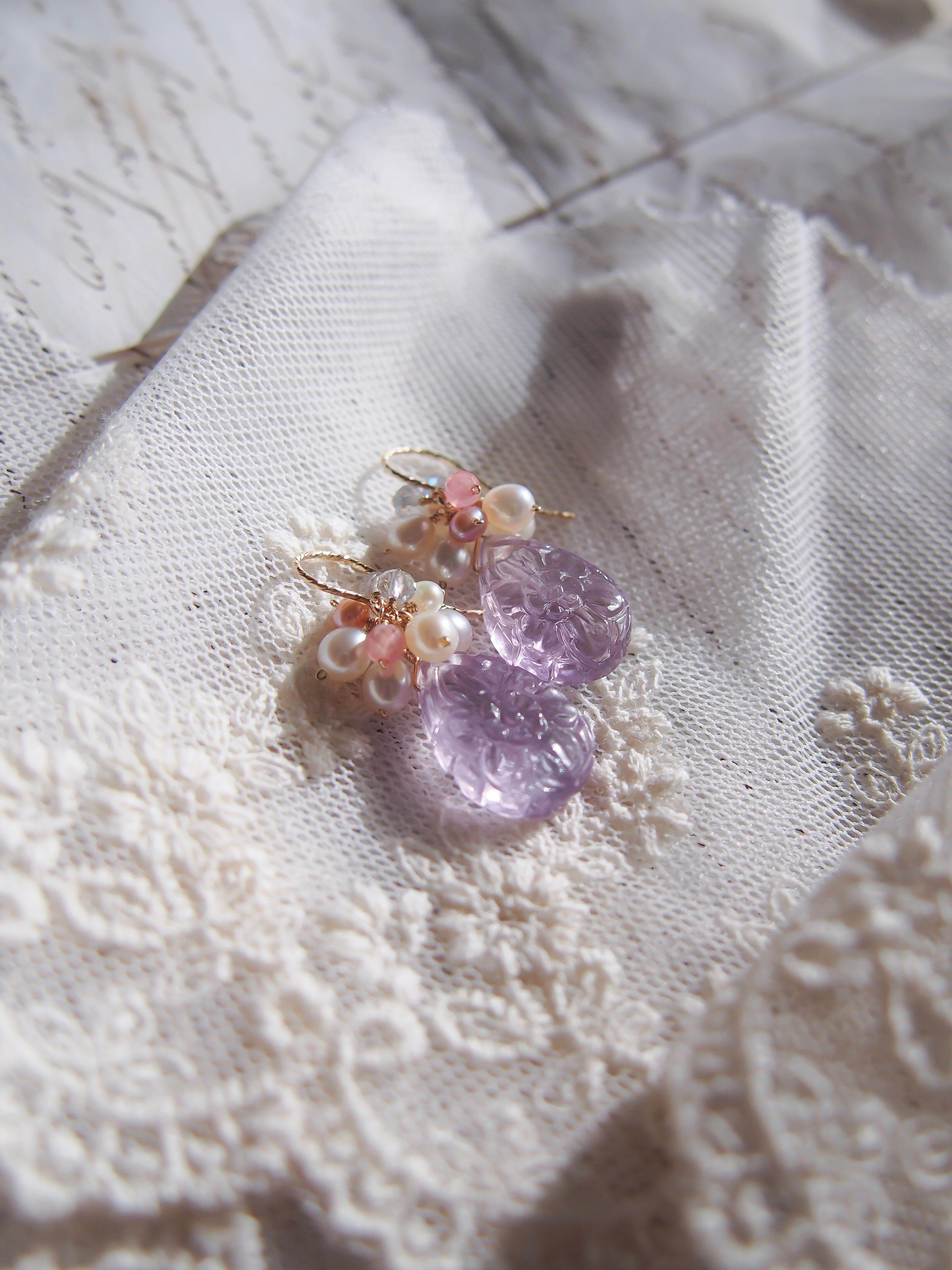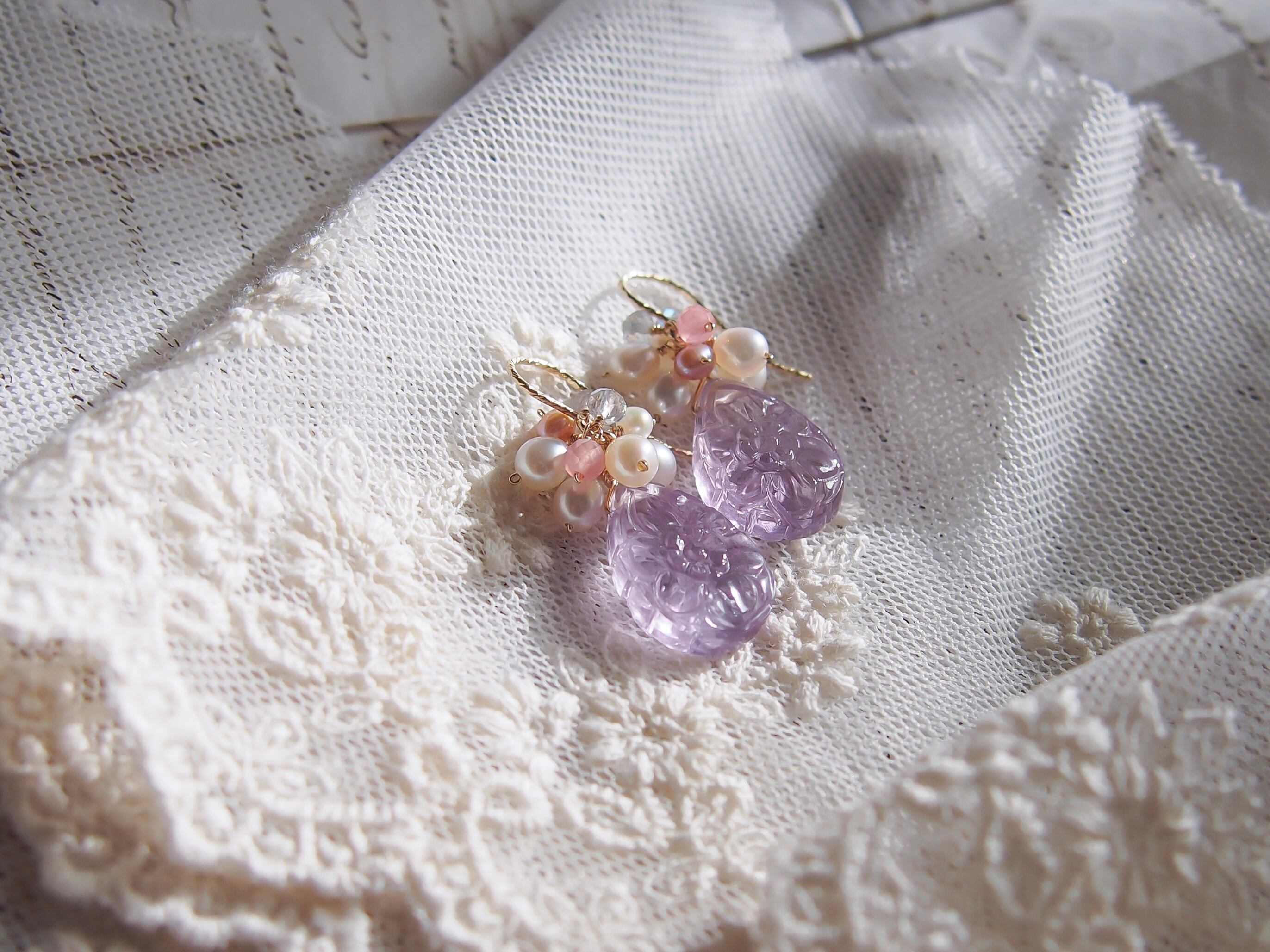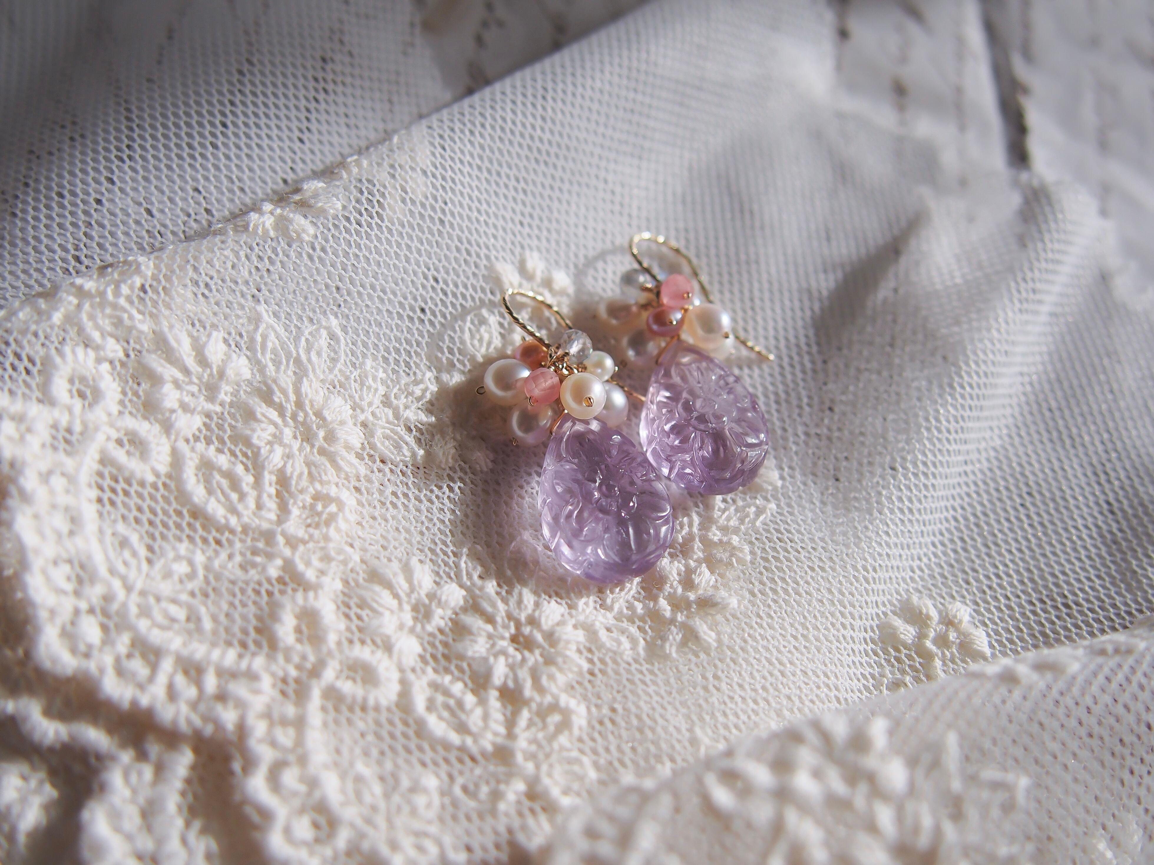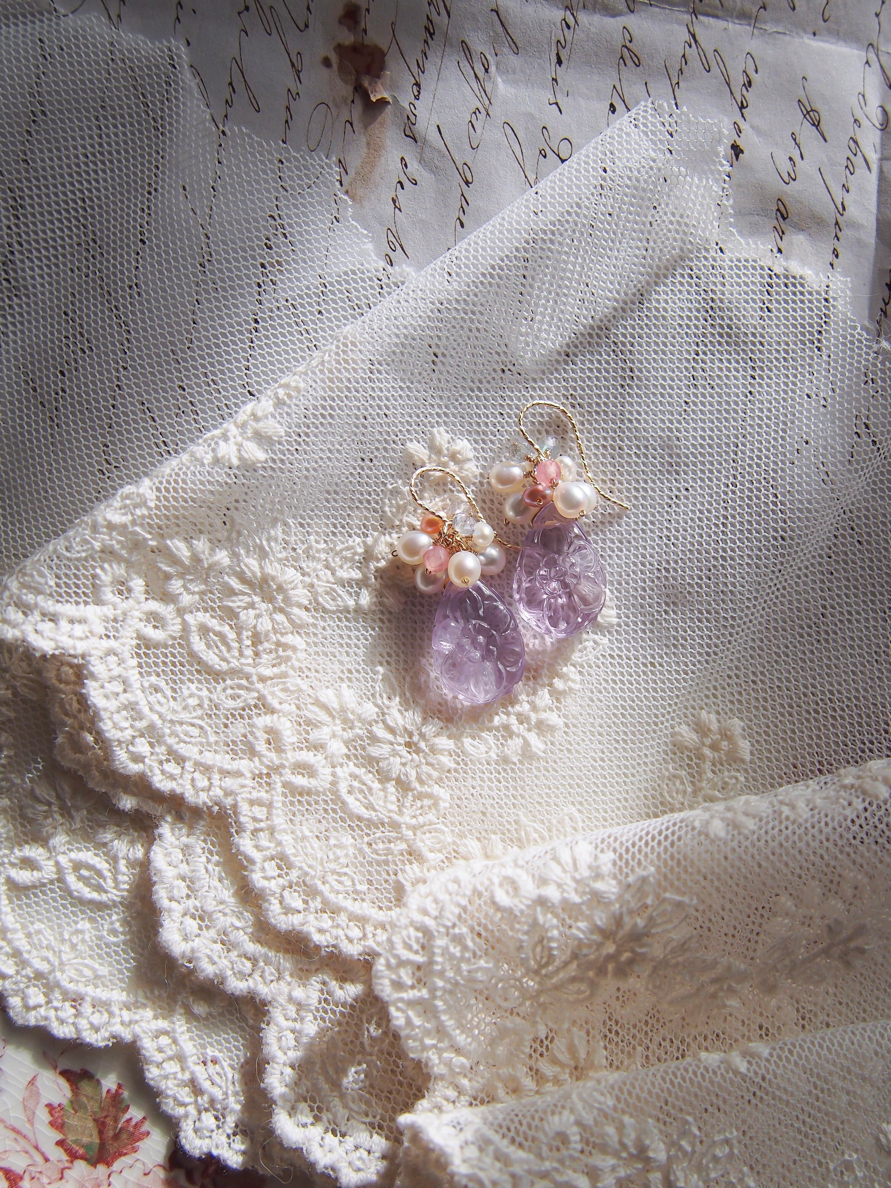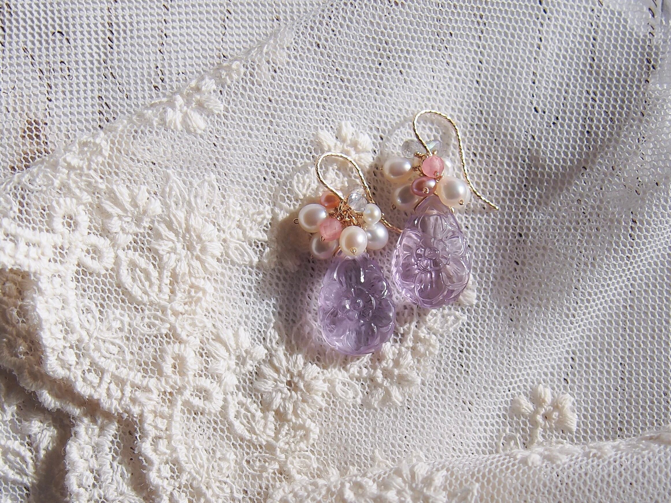 【 Lavender bouquet❤︎ 】高品質 お花彫りラベンダーアメジストと淡水パールのピアス/イヤリング|14kgf 天然石 2月誕生石