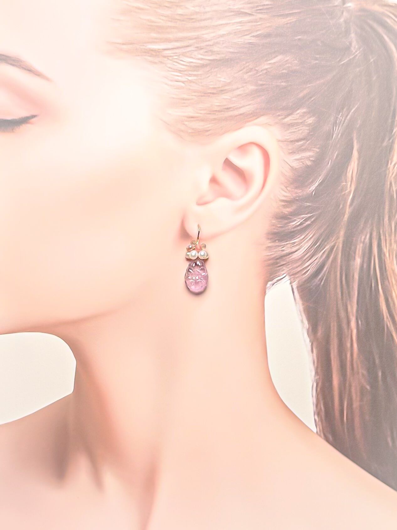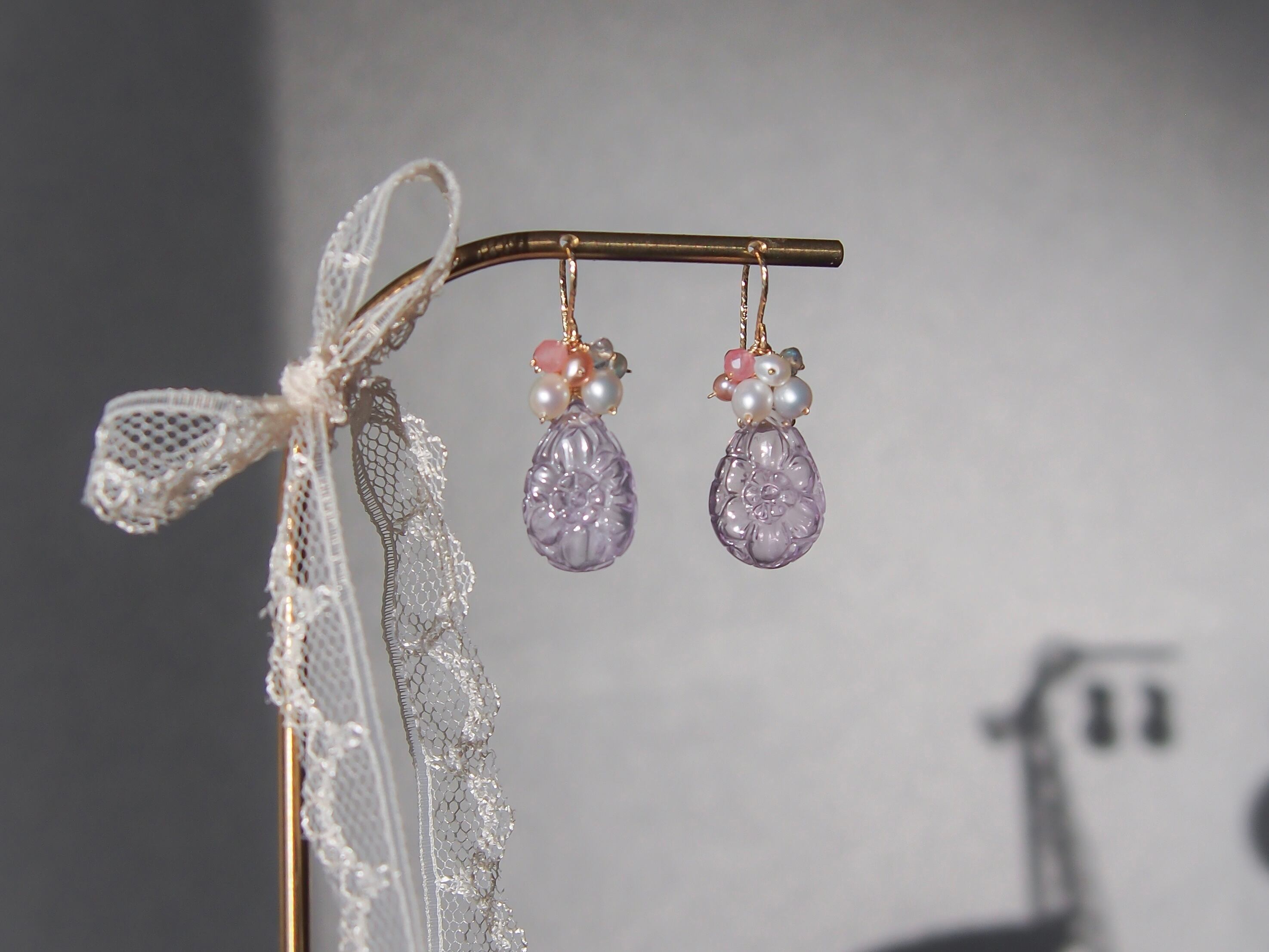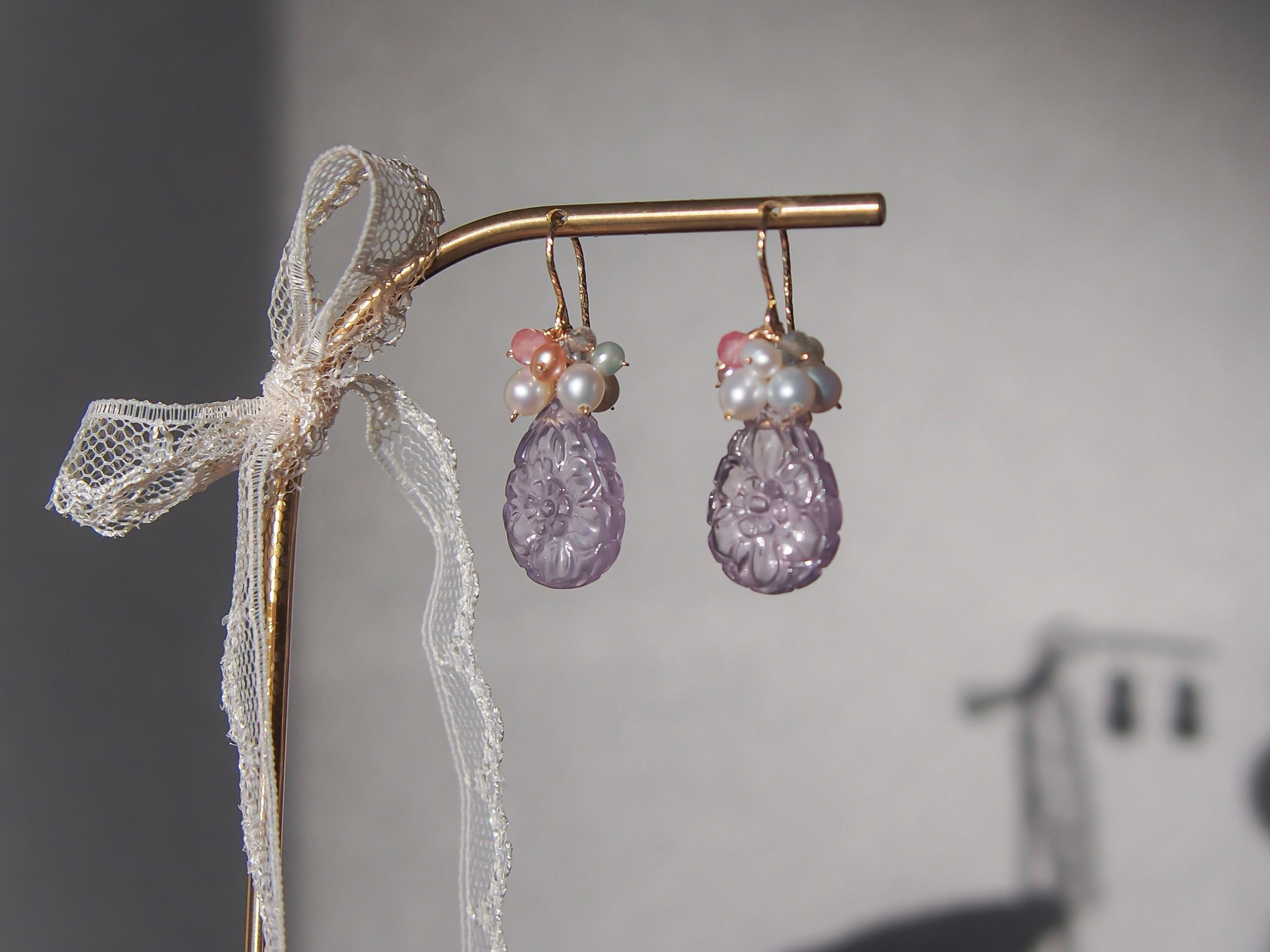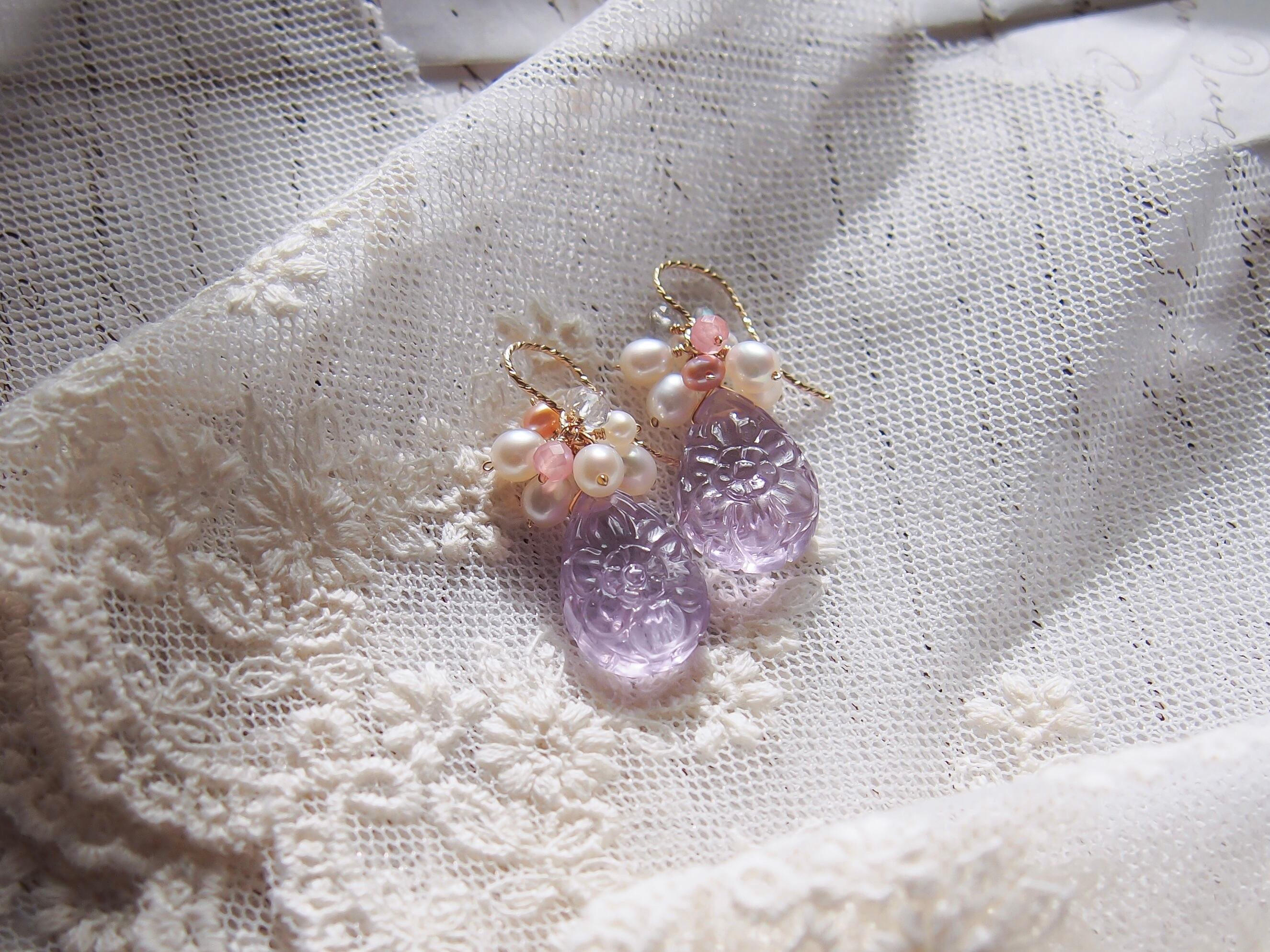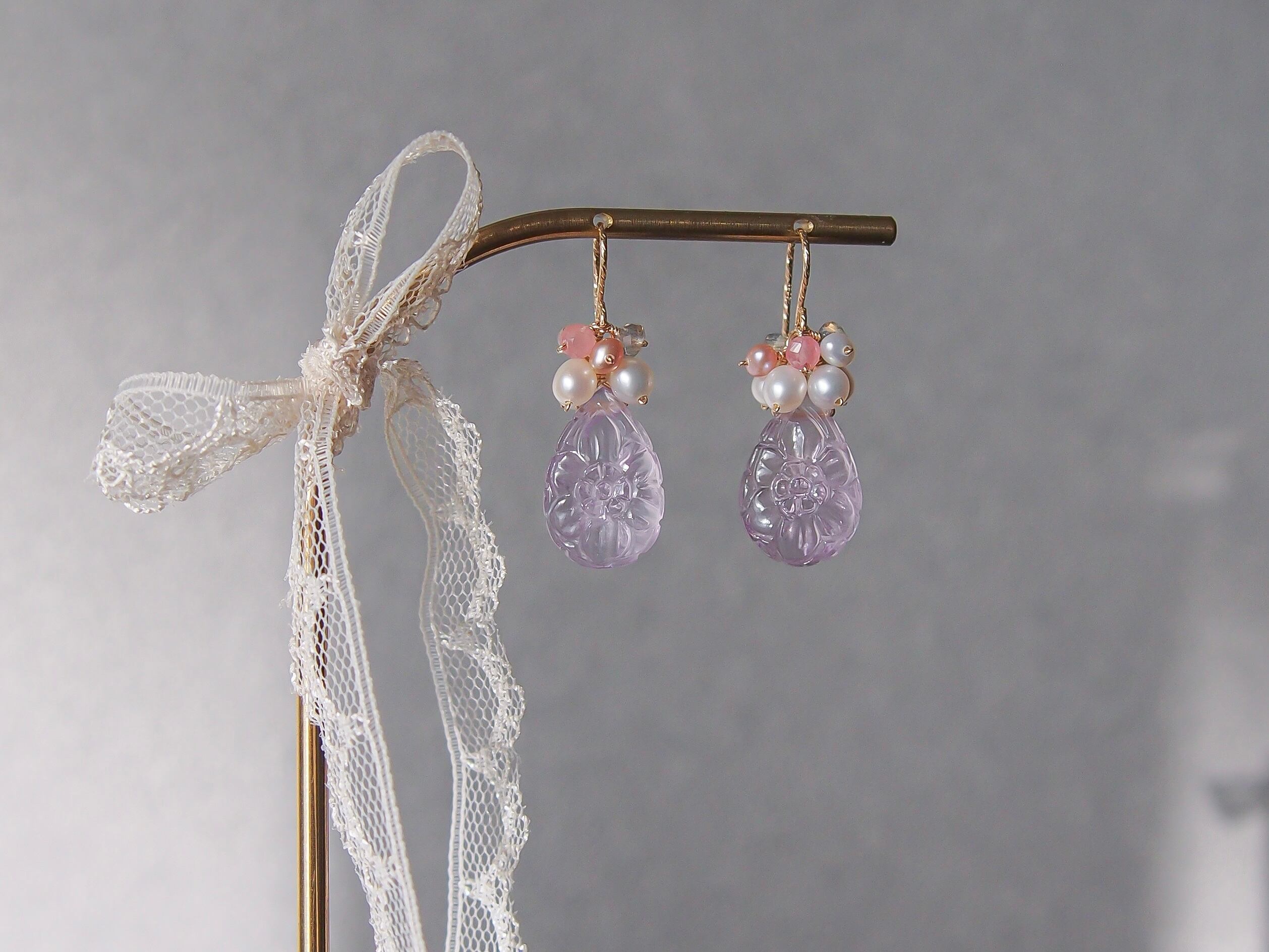【 Lavender bouquet❤︎ 】高品質 お花彫りラベンダーアメジストと淡水パールのピアス/イヤリング|14kgf 天然石 2月誕生石